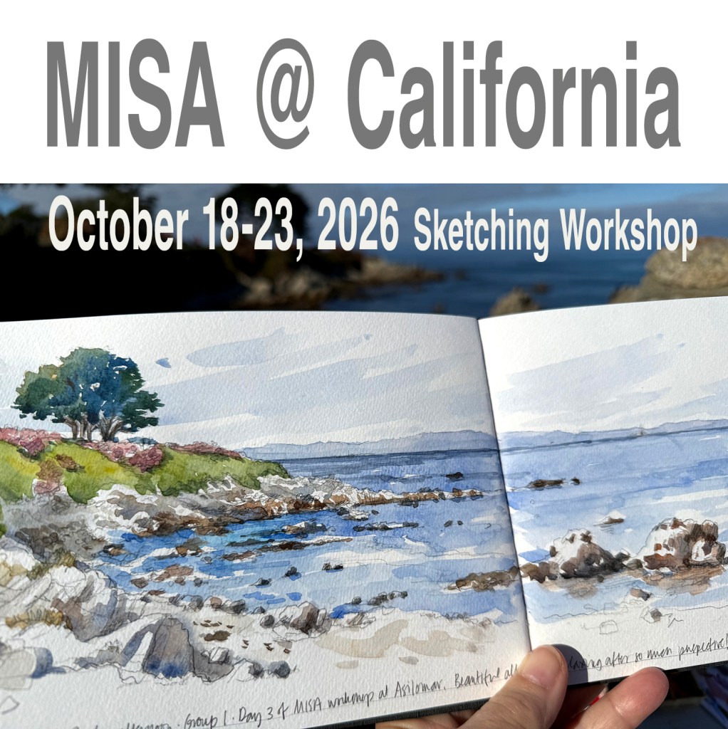 Returning for the second year to the Northern California Coast at Asilomar in Pacific Grove. Organized by Madeline Island School of the Arts, it’s 5 days of unique instruction in that it’s both urban sketching on location AND studio instruction. Essentially, two workshops in one that focus on learning perspective and watercolor. Info is HERE.